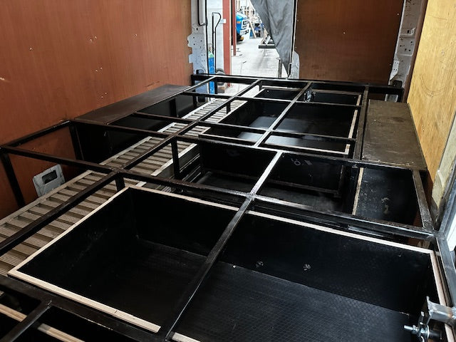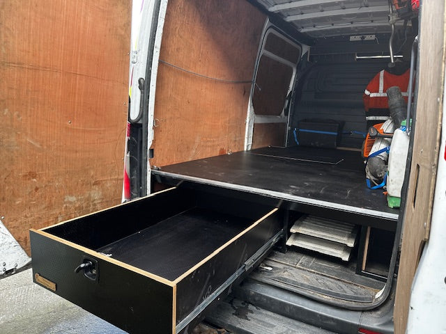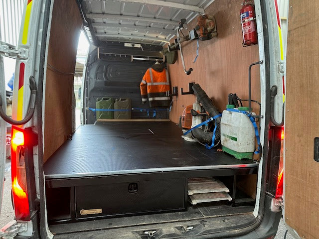 We designed a custom internal fit-out with a heavy-duty false floor, integrated storage, and charging capability, allowing all equipment to be organised, secured, and ready for a full day’s work. The result is a safer, more efficient setup that removes the need for a trailer while keeping tools, batteries, and machinery protected and easy to access.